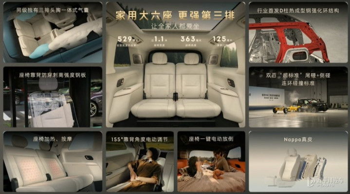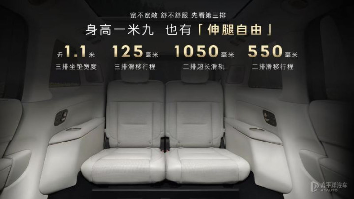 官方宣称二排座椅长滑轨实现前后550mm移动,其次二三排纯平地板依托SPAEvo超混架构,使得乘客进入第三排会更加方便。其次后排中央出风口控制单元采用高清显示屏,支持后排温度调节同时还带冰箱功能。